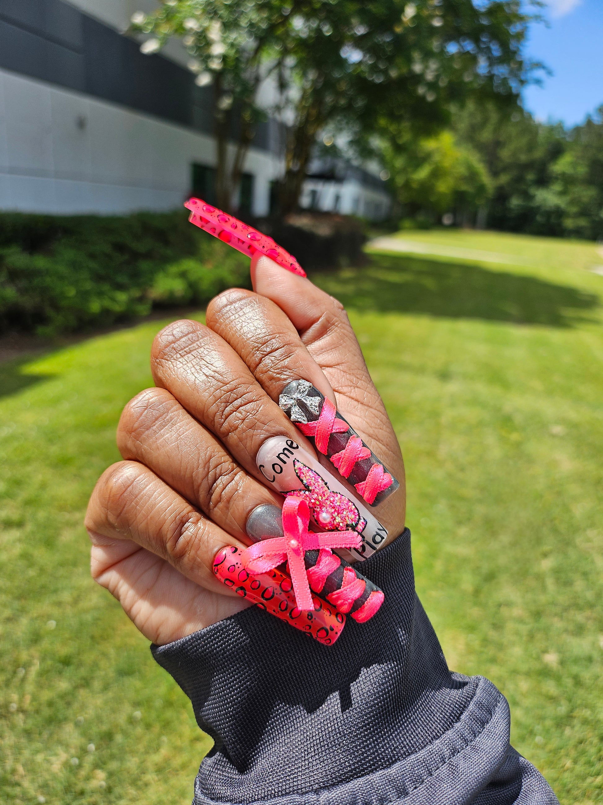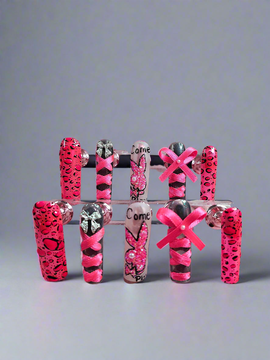 Girls just wanna have fun (and so do women)!!!! These beauties have all the glitz and glamour including real ribbons. Ready to brighten any photoshoot or party. Square shape, ready to ship and customizable just contact me via Email neeshieluxnails25@gmail.com or Instagram DM.