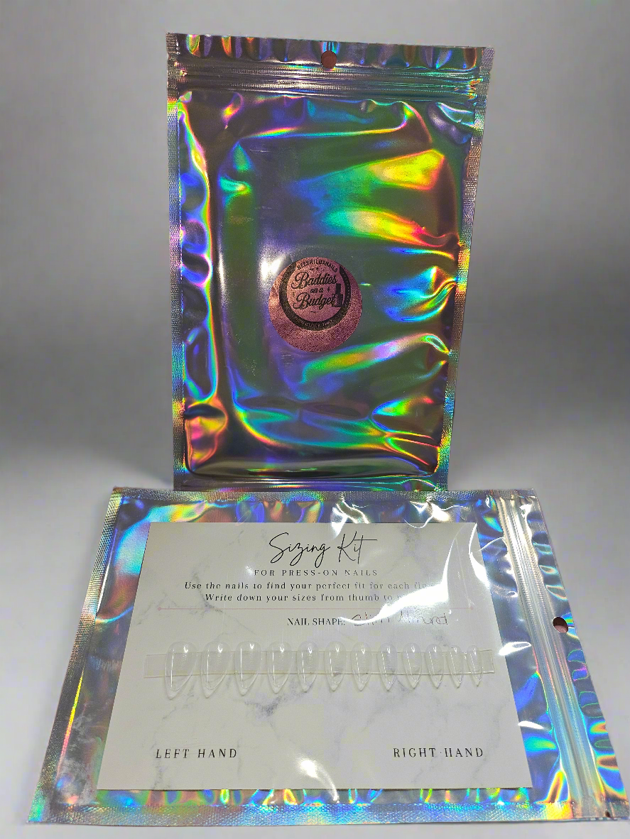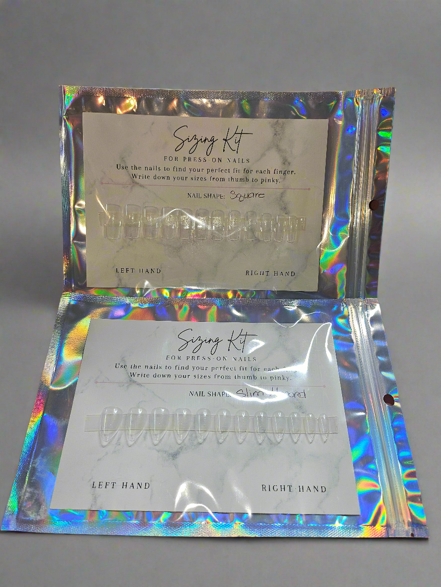 By starting off with a sizing kit before you order, you'll have your customized press on set perfectly fitting to your hands. Once you receive your kit you'll place the tips on each finger to find the perfect match. Be sure that the tip is covering the whole entire nail bed. See video if you need more details on how to properly size your nails.